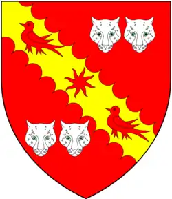 Hearsdon, within the parish of Swimbridge, was anciently a "mansion"[6] and a seat of the Chichester family. A mural monument survives in St James' Church, Swimbridge, to Tristram Chichester (1624–1654) of Hearsdon.[14] He was the second son[15] of Tristram Chichester (1595–1672[16]) (the son of Tristram Chichester[17] (1568–1642[16]) of Hearsdon by his wife Christiana Handford (d.1651) of "Dynnington"[17] in the parish of Swimbridge) by his wife Eleanor (of family unknown) (1603–1647), and was descended from the prominent Chichester family of Hall in the adjoining parish of Bishop's Tawton, itself a junior branch of Chichester of Raleigh, Pilton, near Barnstaple. He married a wife unknown[18] by whom he had four daughters, mentioned in his will but not by name.[17] The monument displays at the bottom the arms of Chichester (with crescent for difference of a second son), impaling the arms of his wife (Sable, a fess vair) and the two arms again on separate shields. Partly behind his head on a smaller shield appear the arms of Chichester impaling: Paly of six argent and gules, on a chief of the second three mascles conjoined in fess of the first (unknown family[19]).