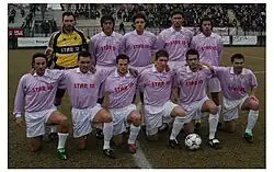 In 1978 Legnano was transformed into a joint-stock company: the goal, which was not achieved, however, was to improve the financial situation through popular shareholding.[126] In the 1978-79 season Legnano participated in the Group B of the new Serie C2 championship, placing third last in the standings with 32 points together with Pro Vercelli. It was saved by winning the play-off played on the neutral field of Pavia on June 17, 1979, in which it defeated Pro Vercelli by 3-1.[126][127] The Lilla's enrollment in the 1979-1980 Serie C2 championship was highly at risk due to major financial difficulties.[128] At this point the Famiglia Legnanese association intervened and managed to find the necessary backers to save Legnano: Giovanni Mari, who had already held this position in the 1950s, was re-elected as president of the Lilla.[8][128] In the 1979-80 season, Legnano competed in the Group B of Serie C2, finishing in 4th place with 43 points, 5 points away from the promotion zone.[128]