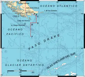 The Dutch expedition to Valdivia of 1643 intended to round Cape Horn sailing through Le Maire Strait but strong winds made it instead drift south and east.[19] Northerly winds pushed the expedition as far south as 61°59 S where icebergs were abundant before a southerly wind that begun on April 7 allowed the fleet to advance west.[19] The small fleet led by Hendrik Brouwer managed to enter the Pacific Ocean sailing south of Isla de los Estados disproving earlier beliefs that it was part of Terra Australis.[19][20][21]