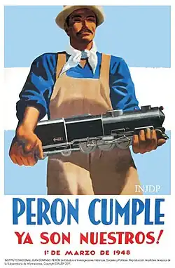The economic project of Peron's government revolved around the consolidation of the industrialization process within Argentina. As to reduce foreign dependency and because the industrial model promised to create many more jobs. This was important considering that in many areas of the Argentine countryside people were barely surviving as field laborers.[7] The Industrial Credit Bank (created in 1944) was key to the consolidation of the industrial sector; during the Peronist governments it financed almost 52% on average of all industrial activity, with peaks of up to 78.3% in 1949, 64.1% in 1951 and 54.2% in 1952.[8]