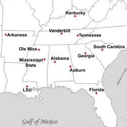 The Razorbacks joined the Southwest Conference (SWC) as charter members in 1915.[12] The conference also included teams from Texas (Baylor, Rice, Texas, Texas A&M) and Oklahoma (Oklahoma, Oklahoma A&M).[13] Southwestern (TX) would also join, but leave the following year.[14] The 1916, 1917, and 1919 teams were led at quarterback by "Arkansas' greatest athlete" Gene Davidson.[15] The Razorbacks didn't have a winning conference record until 1920, and didn't win the conference championship until 1936. Arkansas had the best record during the 1933 season, but had to forfeit the SWC Championship because Ulysses "Heine" Schleuter, who had no eligibility remaining, played on the team.[16] Schleuter had told coach Fred Thomsen that he was eligible, but he was recognized by an SMU player during the game as a former Cornhusker.[16] The Hogs did accept an invitation to the 1934 Dixie Classic, a precursor to today's Cotton Bowl Classic.[17] Arkansas became rivals with Ole Miss due to proximity. Although not SWC members, Ole Miss played Arkansas intermittently until a yearly series began from 1952–1961. During the 1938 season, the Razorbacks replaced their 300-seat stadium known as The Hill with Bailey Stadium, named after Arkansas governor Carl Bailey.[18] It was known as University Stadium for one game before being changed to honor the governor.[19] This stadium still exists today, although heavily renovated, as Donald W. Reynolds Razorback Stadium, the current home of the Razorbacks.[19]