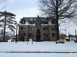 By the 1880s, the quarries had begun to intrude on the site of the university. In 1891, the school broke ground for a new campus at Front Street and Bagley Road. New buildings were constructed and old buildings were moved.[1][11] In 1872, Hulet Hall was built using Berea sandstone, at an original cost of $10,000.[1] Hulet was eventually torn down in 1972.[12] The new buildings include Recitation Hall (now called Wheeler Hall), which was built in 1891; the ground-breaking ceremony was led by Mary Baldwin, John's daughter.[13] Current buildings from Baldwin University that still exist include the Philura Gould Baldwin Library and Carnegie Hall. Today, Baldwin Library and Carnegie Hall are connected and have been added as part of Malicky Hall.[14]