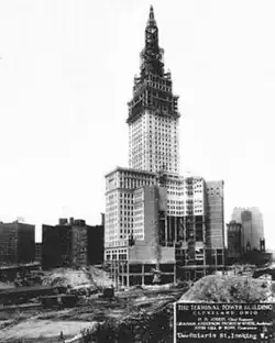 In politics, the city began a brief experiment with a council–manager government system in 1924.[62] William R. Hopkins, who became the first city manager, oversaw the development of parks, the Cleveland Municipal Airport (later renamed Hopkins International Airport), and improved welfare services.[63] In 1923, the building of the Federal Reserve Bank of Cleveland on East 6th Street and Superior Avenue was opened, and in 1925, the main building of the Cleveland Public Library on Superior was opened under the supervision of head librarian Linda Eastman, the first woman ever to lead a major library system in the world.[64] Both buildings were designed by the Cleveland architectural firm Walker and Weeks.[65][66] In 1926, the Van Sweringen brothers, who had previously worked to improve Cleveland's trolley and rapid program, began construction of the Terminal Tower skyscraper in 1926 and, by the time it was dedicated in 1930, Cleveland had a population of over 900,000.[67][33] Until 1967, the tower was the tallest building in the world outside of New York.[68]
