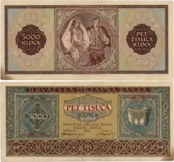 From 1941–1945 during World War II in Yugoslavia, the Independent State of Croatia officially adopted the Kuna as the currency for the first time on 26 July 1941. The Independent State of Croatia kuna at the time of adoption included banknotes of 10, 50, 100, 500, and 1,000. Banknotes of 1, 2, were later introduced in 1942, and 5,000 banknotes were added in 1943.[10] The Kuna started with a fixed exchange rate of 20.00 Kn (Kuna) = 1 RM (Reichsmark), the currency for Germany at the time.[11] By 6 May 1945, the exchange rate between the Kuna and Reichsmark was fixed at 120.00 Kn (Kuna) = 1 RM (Reichsmark)[10]