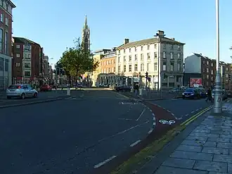 Áth Cliath was centred on the crossroads formed by the intersection of the Slige Midluachra and Slige Mhór. After the introduction of Christianity a wayside chapel dedicated to St Mo Lua appears to have been erected at this junction, though the earliest reference to such a church is of a much later date.[15] Another early church, dedicated to St Columba, occupied the site of the present Church of St Audoen, which is thought to be the city's oldest surviving church site. The existence of a market place to the east of the junction is suggested by the modern street name of Cornmarket. The southwestern approaches of Áth Cliath may have been protected by a ditch, which is mentioned in two 13th century documents.
