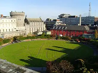 In addition to the urban settlement at Áth Cliath, the early inhabitants of Dublin may also have constructed a ringfort, or ráth, on the present site of Dublin Castle. This would have been a relatively easy place to defend, being the highest point in the area and surrounded by water on three sides. It could also explain why the eastern terminus of the Slige Mhór lay several hundred metres beyond Áth Cliath. If such a rath did exist, it may have been the source of the placename Druim Cuill-Choille, or "Hazelwood Ridge": according to Harris (1736), this was the city's original name, though no ancient references to such a name are now extant.[16]
