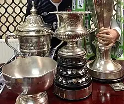 ![]() President's Cup, FAI Cup, Leinster Senior Cup & League of Ireland Champions trophy on display in Oriel Park in 2015 | |