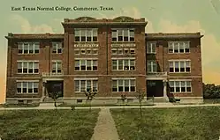 ETNC resumed operation in Commerce in September 1894 with just 35 students in a small rented store, although shortly thereafter it built a two-story classroom and administration building known as College Hall.[3][6][7][8] The college grew slowly but steadily during the 1890s, reaching 132 students in 1896 and 212 in 1897.[7] By 1907, ETNC had established a reputation as "the best attended summer institute for teachers in the state".[9] After moving to Commerce, the ETNC campus burned twice more, in 1907 and again in 1911.[10][11]