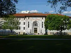 In light of these developments, Emory College was rechartered by DeKalb County on January 25, 1915, as Emory University.[1] Within three months of Candler's endowment, in September 1914, the first school within the university—the Candler School of Theology—had begun classes.[2] Henry Hornbostel was chosen to as the primary architect to design many of the buildings on Emory University's new campus. His designs incorporated local stone and materials, including marble and red terracotta tile, which established the institution's unique architectural character. By September 1919, Emory University had created a school of law, medicine, business, and graduate studies. The Nell Hodgson Woodruff School of Nursing and Emory University School of Dentistry (closed 1992) would be formed in 1905 and 1944 respectively. Doctoral studies at Emory University were established in 1946, and the school has continued to strengthen its graduate and professional schools since. In 1949, Alben Barkley returned to Emory to receive an honorary LLD degree and give the commencement address, the first Emory event to be televised.[8] The University's newest school, the Rollins School of Public Health, formed in 1990.