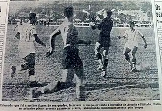 The pinnacle of this era was 1935, marked by the Grenal Farroupilha, a name given to the entire city championship held to commemorate the centenary of the Farroupilha Revolution. By defeating its traditional rival, the Tricolor claimed the title. This match was the last for Eurico Lara, who began playing for the club in 1920 and became a club legend. Thus, this period not only brought titles but also laid the foundation for Grêmio's tradition and respect.[2][3]