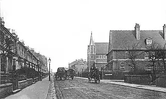 Catering for religious needs there were, five churches on the combined estates. The first of these was the temporary St. Paul's Church of England (Iron Church) on the corner of Green Lanes and Burgoyne Road which opened on 23 December 1883.[17] A permanent church at the other end of Burgoyne Road on the junction with Wightman Road opened in the early 1890s. St. Peter's, situated at the corner of Lausanne and Wightman Roads was opened in October 1884.[18] At some time around 1888/1889 a Wesleyan Methodist Chapel opened in Hampden Road[7] and early in 1891 the Primitive Methodists opened a Chapel in Mattison Road.[19] The Emmanuel Union Chapel was built in Duckett Road at about the same time.[20]