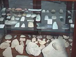 During the period before the Christian era, the Iberian Peninsula was inhabited mainly by the Iberian people, and invaded by the Celts in the 4th century BC, who eventually merged into the Celtiberians.[11] According to tradition, in about 1899 BC, a settlement called Lacobriga was founded in the area where present-day Lagos is located,[1] although the location of this urban nucleus has not been completely determined, with Fonte Coberta, Serro da Amendoeira, Paúl, Figueira da Misericórdia, and Monte Molião having been put forward as hypotheses, the latter being considered the most probable site.[3] The formation of the city is linked to a legend in which a grandson of Tubal, called Brigo, the fourth king of Hispania, built several fortified cities along his territory, which were named Brigos after their founder.[2] This legend was also related in a manuscript called "Fundação de Lagos" (Foundation of Lagos), which was part of the library of the Senhora da Glória Convent, and which stated that Brigo, in the year of the creation of the world 1839, the flood of 2145 and 2161 BC, had founded a settlement in the place later known as Paúl da Abedoeira, which was named Lacobriga, combining both the nature of the area and the name of its founder.[2] Father João Baptista Carvalho estimated that the city of Lacobriga had been created in 1006 BC, based on the work "Euchiridion de los Tiempos", while the "Encyclopedia Portuguesa Illustrada – Diccionario Universal" mentioned that according to Father Cardoso Rodrigues, Mendes da Silva and other authors, the city had been built by Brigo in 1899 BC.[2] The "Diccionario Corographico" de Francisco Cardoso de Azevedo informed that according to some sources, the city had been created in 1897 BC by Brigo, while others pointed to the Carthaginians as founders.[2] The historian Florião do Campo, on the other hand, stated that the city had been founded by the Lakons.[2] The term Brigo was explained by the journal "Archeologo Portuguez" as having a Celtic origin, meaning fortress.[2] The works "Corographia do Algarve" and "História do Regimento de Infantaria n.º 15" put forward Paul's site as the probable location of the ancient city, a theory corroborated by the archaeologist Estácio da Veiga, who identified that site as the Lacobriga described by Pomponius Mela.[2] In fact, several vestiges of Roman occupation were found at Paul's site.[2] According to the "Archivo Historico de Portugal", Lacobriga was located about 1,500 m away from the center of the current city of Lagos, while other authors thought it would have been located on Monte Molião, a hill about 1,200 m from the center, which was excavated by Estácio da Veiga, where prehistoric remains were found, such as crockery and animal bones, and Roman ones, such as a cemetery, crockery and other objects, and several structures, including a cistern about 4 m deep.[12] The site of Lacobriga was also found at the Paul's site.