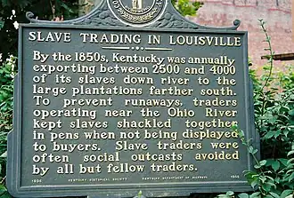 Louisville had one of the largest slave trades in the United States before the Civil War, and much of the city's initial growth is attributed to that trade. Shifting agricultural needs produced an excess of slaves in Kentucky, and many were sold from here and other parts of the Upper South to the Deep South. In 1820, the slave population was at its height at nearly 26% of the Kentucky population, but by 1860, that proportion had dropped significantly, even though this percentage still represented over 10,000 people. Through the 1850s, slave traders sold 2500–4000 slaves annually from Kentucky down river.[36]