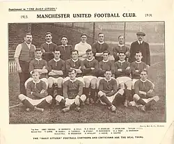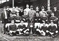 In January 1902, with debts of £2,670 – equivalent to £370,000 in 2023[2] – the club was served with a winding-up order.[3] Captain Harry Stafford found four local businessmen – including John Henry Davies, who became club president – each willing to invest £500 in return for a direct interest in running the club.[4] As a mark of this fresh start, on 24 April 1902, the club's name was changed to "Manchester United".[5][6] Under Ernest Mangnall, who became club secretary in 1903, the team finished as Second Division runners-up in 1906 and secured promotion to the First Division, which it won in 1908 – the club's first league title. The following season began with victory in the first ever Charity Shield[7] and ended with the club's first FA Cup trophy. Manchester United moved to a new stadium at Old Trafford in 1910, and won the First Division for the second time in 1911, but at the end of the following season, secretary Mangnall left to join Manchester City.[8]