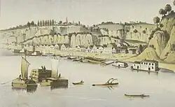 In the late 18th century, Natchez was the starting point of the Natchez Trace overland route, a Native American trail that followed a path established by migrating animals, most likely buffalo, which ran from Natchez to Nashville through what are now Mississippi, Alabama, and Tennessee. Produce and goods were transported on the Mississippi River by the flatboatmen and keelboatmen, who usually sold their wares at Natchez or New Orleans, including their boats (as lumber). A Mississippi River navigation guide published in 1817 stated, "The Natchez landing affords a pretty safe harbor for boats it being in the shape of a half moon. The wind seldom disturb it unless indeed very high, and not then to any damage if care be taken to fasten well and keep the boat easy and evenly afloat."[14] The boatmen made the long trek back north to their homes overland on the Natchez Trace. The boatmen were locally called "Kaintucks" because they were usually from Kentucky, although the entire Ohio River Valley was well-represented among their numbers. The Trace was traveled heavily until the development of steamboats in the 1820s allowed northward navigation (against the current) on the River.