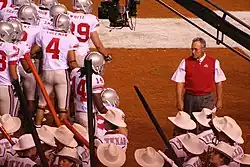 Ohio State quickly sought a replacement for Cooper before the 2001 recruiting season, and after a nationwide search hired Jim Tressel.[58] With a winning tradition at Youngstown State (4 NCAA Division I-AA National Champions from 1986 to 2000) Tressel, formerly an assistant coach at Ohio State for Earle Bruce, was an Ohioan who was considered to be appreciative of the Buckeyes' football tradition. Although there were some doubts whether Tressel could repeat his earlier success at the Division 1A level, most fans and alumni met the coaching change with enthusiasm. The day of his hiring, Jim Tressel, speaking to fans and students at a Buckeye basketball game, made a prophetic implication that he would lead the Buckeyes to beat Michigan in Ann Arbor the following November.[59] Tressel's first season was difficult as the Buckeyes went 7–5. At a university that was accustomed to experiencing fewer than 2 or 3 losses a season, 2001 was considered a disappointment until Tressel made good on his promise and did what his predecessor could not, beating Michigan in Ann Arbor. Even more impressive was that Tressel gave the quarterback reins to untested sophomore Craig Krenzel after senior starter Steve Bellisari was suspended following a DWI arrest just prior to the Illinois game, a decision applauded as finally drawing the line on a program perceived as "getting out of hand".[60] Despite its average record, Ohio State elected to accept an invitation to the Outback Bowl for a rematch with South Carolina. Although Ohio State lost this game also, it was marked by a strong second half comeback and were a presentiment that 33 years of frustration at not winning a national championship were about to come to an immediate end.