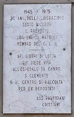 The Sesto C.L.N. was born in the winter of 1943/44 and found its origin in the unitary activity of struggle in the factories. Established early compared to the others in the Milan area, it was significantly named "CLN of Sesto San Giovanni and Bicocca."[59] The tasks of the clandestine C.L.N. were organizational and political, and it was the committee that maintained links with the partisan formations that were being formed among the masses. Dependent on the C.L.N of Sesto were the company C.L.Ns of 40 factories and small workshops in addition to the area, ward, public agency and bank committees. From March 1945, the C.L.N., which until then used to meet in the city streets or countryside, decided to set as its permanent meeting place the San Luigi Oratory in the parish of Santo Stefano.[60]