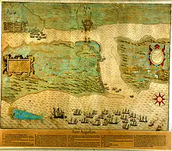 Pedro Menéndez's ships first sighted land on August 28, 1565, the feast day of St. Augustine of Hippo. In honor of the patron saint of his home town of Avilés, he named his settlement San Agustín.[16] The Spanish sailed through the inlet into Matanzas Bay and disembarked near the Timucua town of Seloy on September 6.[17][18][19] Menéndez's immediate goal was to quickly construct fortifications to protect his people and supplies as they were unloaded from the ships, and then to make a proper survey of the area to determine the best place to erect the fort.