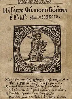 Economic decline of cities under the pressure of landed gentry, as well the abolition of Orthodox hierarchy by Polish Catholic authorities, led to the decrease in cultural activities among the urban classes of today's Western Ukraine during the 17th century.[23] As a result, the development of Ukrainian literature continued further to the east, in the lands of Dnieper Ukraine centered around Kyiv. Cultural development of that area was seriously influenced by Zaporozhian Cossacks, who used their political influence over the Commonwealth to support Ukrainian Orthodox clergy. This process was especially active during the hetmanate of Petro Sahaidachny.[24] The main centre of literary activities and publishing emerged in Kyiv Pechersk Lavra, represented by authors and publishers such as Pamvo Berynda, Zacharias Kopystensky, Taras Zemka, Yelysei Pletenetskyi, Tymofii Verbytskyi, Spiridon Sobol,[25] and Oleksandr Mytura.[26]