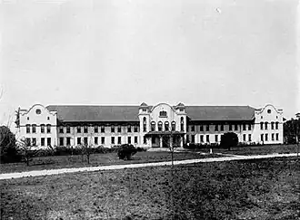The first building on the campus, constructed between 1912 and 1913, was named in honor of William Lorraine Converse Sr. who, as a State Representative, helped expedite the establishment of the college in Valdosta. On December 19, 1912, Dr. Powell moved into office his in the new building and the first pieces of furniture were installed in preparation if the school's opening.[2] Converse Hall served a variety of purposes for the new institution. The structure provided classrooms, administration offices, double-occupancy dormitory rooms, a dining hall, an infirmary, and a chapel. The Spanish Colonial Revival architecture of college in Valdosta was based on the popular style of the era, as well as Powell's personal experiences in the American Southwest. The school opened in January 1913, but the surrounding landscape was primarily undeveloped There were no driveways or sidewalks, and the predominant wetlands at the south were only crossable at Patterson Street.