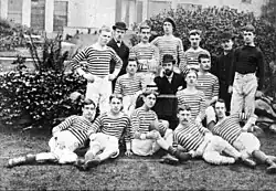 The club was founded in 1878 as West Bromwich Strollers in West Bromwich, then in Staffordshire but now part of the West Midlands administrative county. Older sources quote the year of formation as 1879, as evidence of the first Strollers match in 1878 came to light only as recently as 1993.[1] The team played their first match on 23 November 1878, drawing 0–0 in a 12-a-side game against workers from Hudson's, a local soap factory.[2] Most of the Strollers players worked at George Salter's Spring Works; many were keen cricketers and were looking for a sport to play during the winter months. The 'Strollers' name came about because there were no footballs on sale in West Bromwich, so a walk to nearby Wednesbury was necessary in order to buy one. They were renamed West Bromwich Albion in either 1879 or 1880, becoming the first team to adopt the Albion suffix. Albion was a district of West Bromwich where some of the players lived or worked, close to what is today Greets Green.[1]