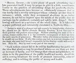 "Old Dr. Gordon's Pearls of Health", produced by a drug company in Montreal, "cure[d] all suppressions and irregularities" if "used monthly".[120] However, a few ads explicitly warned against the use of their product by women who were expecting, or listed miscarriage as its inevitable side effect. The copy for "Dr. Peter's French Renovating Pills" advised, "... pregnant females should not use them, as they invariably produce a miscarriage ...", and both "Dr. Monroe's French Periodical Pills" and "Dr. Melveau's Portuguese Female Pills" were "sure to produce a miscarriage".[6] F.E. Karn, a man from Toronto, in 1901 cautioned women who thought themselves pregnant not to use the pills he advertised as "Friar's French Female Regulator" because they would "speedily restore menstrual secretions."[120] Historian Ann Hibner Koblitz comments that "Nineteenth-century customers would have understood this 'warning' exactly as the sellers intended: as an advertisement for an abortifacient preparation."[121]: 44