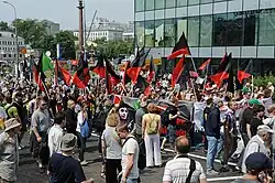 Following the German Revolution, the FVdG resumed its activities within the rising council movement, advocating for workers' councils to take over production and distribution.[92] The syndicalists gained particular influence in the councils of the Bavarian Soviet Republic,[93] which included the anarchists Gustav Landauer and Erich Mühsam among its leadership.[94] But by 1920, the council movement had declined and was integrated into the new Weimar Republic.[95] After leading a general strike in the Ruhr, the syndicalists began to gain more influence in the region,[96] with the FVdG reorganising itself into the Free Workers' Union of Germany (FAUD), which counted 112,000 members at the time of its founding congress.[97] In March 1920, the FAUD played a leading role in the Ruhr uprising against the Kapp Putsch, organising workers' councils throughout the region, taking control of the Thyssen steel factories and fielding 45% of the members of the "Red Army of the Ruhr". The uprising was suppressed, but the FAUD's influence continued to grow and they persisted in open revolts against the Republican government.[98] Although increasing repression against the FAUD led to a decline in their strength, they continued organising workers and attempted to resist the Occupation of the Ruhr, but the country's economic collapse damaged its ability to organise workers and its membership fell to 30,000.[99]