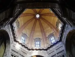 Vasari was brought on to build the dome in the mid-1500s and changed the original dome profile from a pointed arch to a hemispherical design, which had larger horizontal thrusts, but the supporting drum was relatively high and weak and no supporting encirclement was used during the dome's construction. The lantern is also relatively heavy: it is 1/8th of the weight of the entire dome, compared to the lantern of Florence Cathedral being 1/25th.[80] Vasari urgently ordered the first iron ring before the dome was finished, then a second immediately after the first was installed in 1575 (or 1570-1572[79]).[81] An additional tie rod ring was placed in 1585, two more in 1592 (one of which was substituted in 1840-1846 after being broken by lightning), one in 1617 after debris fell from cracks in the dome, and two in 1920/1966 after the earthquake of 1917, for a total of seven external rings and one internal ring.[79] The cost of the Renaissance-era tie rods may have been in the same order of magnitude as the cost of the dome itself.[81]