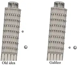 - ^ a b Vincenzo Viviani (1717), Racconto istorico della vita di Galileo Galilei, p. 606: [...dimostrando ciò con replicate esperienze, fatte dall'altezza del Campanile di Pisa con l'intervento delli altri lettori e filosofi e di tutta la scolaresca... [...Galileo showed this [all bodies, whatever their weights, fall with equal speeds] by repeated experiments made from the height of the Leaning Tower of Pisa in the presence of other professors and all the students...].