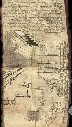 In the 10th century AD Al-Farabi described two types of tanburs found in Persia, a Baghdad tunbūr, distributed south and west of Baghdad, and a Khorasan tunbūr.[46][47] This distinction may be the source of modern differentiation between Arabic instruments, derived from the Baghdad tunbūr, and those found in northern Iraq, Syria, Iran, Sindh and Turkey, from the Khorasan tunbūr.[46]