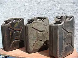 The North African campaign saw the widespread adoption of the 20 litre jerry can, a German invention that was copied by the British and Americans. The jerry can had convenient carrying handles and could be stacked. It did not shift or roll in storage, and floated in water when filled with petrol. The British version was an exact copy of the German model; the American version, called an Ameri-can by the British, was slightly smaller, with a screw cap onto which a nozzle could be fitted. It weighed 4.5 kilograms (10 lb) empty, and 18 kilograms (40 lb) when filled with petrol, so 56 filled cans weighed 1.0 tonne (1 long ton).[150] Some 11.5 million jerry cans were provided for Operation Overlord. Of these, 10.5 million were manufactured in the UK and supplied to the US Army under Reverse Lend-Lease, while the rest came from the US.[151]
