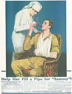 In the face of imminent violent death, the health harms of cigarettes became less of a concern, and there was public support for drives to get cigarettes to the front lines.[12] Billions of cigarettes were distributed to soldiers in Europe by national governments, the YMCA, the Salvation Army, and the Red Cross. Private individuals also donated money to send cigarettes to the front, even from jurisdictions where the sale of cigarettes was illegal. Not giving soldiers cigarettes was seen as unpatriotic.[2]