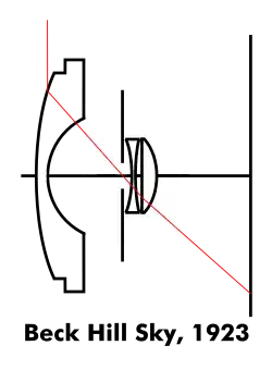 The first fisheye lens was the Beck Hill Sky (or Cloud; UK) lens of 1923. Robin Hill intended it to be pointed straight up to take 360° azimuth barrel distorted hemispheric sky images for scientific cloud cover studies.[66] It used a bulging negative meniscus to compress the 180° field to 60° before passing the light through a stop to a moderate wide angle lens.[9]: 557 The Sky was 21mm f/8 producing 63 mm-diameter images.[67] Pairs were used at 500 meter spacing producing stereoscopes for the British Meteorological Office.[68]