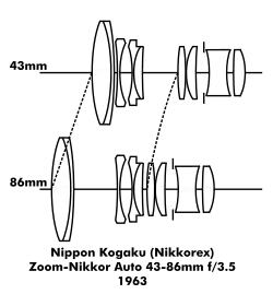 Most early zoom lenses produced mediocre, or even poor, images. They were adequate for low resolution requirements such television and amateur movie cameras, but usually not still photography. For example, Nippon Kogaku always apologetically acknowledged that Takashi Higuchi's Zoom-Nikkor Auto 43-86mm f/3.5, the first popular zoom lens, did not meet its normal image quality standards.[104] However, efforts to improve them were ongoing.