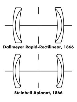 The Globe's symmetric formula directly influenced the design of the Dallmeyer Rapid-Rectilinear (UK) and Steinheil Aplanat (modern Germany). By coincidence, John Dallmeyer's Rapid-Rectilinear and Adolph Steinheil's Aplanat had virtually identical symmetric four-element formulae, arrived at almost simultaneously in 1866, all of which corrected most optical aberrations, except for spherical and field curvature, to f/8. The breakthrough was to use glass of maximum refractive index difference but equal dispersion in each achromat. The Rapid-Rectilinear and Aplanat lenses were scalable over many focal lengths and fields of view for all contemporaneous media, and they were the standard moderate-aperture, general-purpose lenses for more than half a century.[1]: 59–62 [2]: 167