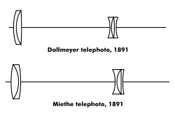 In 1891, Thomas Dallmeyer and Adolf Miethe simultaneously attempted to patent new lens designs with nearly identical formulae – complete photographic telephoto lenses consisting of a front achromat doublet and rear achromat triplet. Primacy was never established and no patent was ever granted for the first telephoto lens.[1]: 133–134