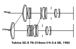Convenience of a different sort was the major feature of the Tokina SZ-X 70-210mm f/4-5.6 SD (Japan) of 1985. It was the first ultra-compact zoom (85×66 mm, 445 g, 52mm filter); half the size of most earlier 70-210 zooms[125] (the third generation Vivitar Series 1 70-210mm f/2.8-4 [1984, USA/Japan] was 139×70 mm, 860 g, 62mm filter).[126] Like the Kiron 28-210mm, the twelve element/eight group/three cell Tokina had a small variable maximum aperture, but added low dispersion glass and a new bidirectional nonlinear zooming action, to bring size and weight down to an absolute minimum.[127]