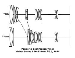 In 1974, the Ponder & Best (Opcon/Kino) Vivitar Series 1 70-210mm f/3.5 Macro Focusing Zoom (USA/Japan) was widely hailed as the first professional-level quality very close focusing "macro" zoom lens for 35mm SLRs. Ellis Betensky's (USA) Opcon Associates perfected the Series 1's fifteen element/ten group/four cell formula by calculations on the latest digital computers.[105] Freed from the drudgery of hand computation in the 1960s, designs of such variety and quality only dreamt of by earlier generations of optical engineers became possible.[106][107] Modern computer created zoom designs may be so complex that they have no resemblance to any of the classical human created designs.