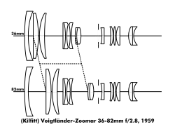 The first zoom lens for still cameras was the Voigtländer-Zoomar 36-82mm f/2.8 (USA/West Germany) of 1959,[97] for Voigtländer Bessamatic series (1959, West Germany) 35mm leaf shutter SLRs.[98] It was designed by Zoomar in the United States and manufactured by Kilfitt in West Germany for Voigtländer.[99] The Zoomar 36-82 was very large and heavy for the focal length[100] – 95mm filter size.[101] Frank Back (Germany/USA) was the early champion of zoom lenses and his Zoomars would hurl far into the future the lance of zoom lens development and popularity, starting with his original Zoomar 17-53mm f/2.9 (1946, USA)[102] for 16mm motion picture cameras.[1]: 170 The image quality of early zoom lenses could be very poor – the Zoomar's has been described as "pretty rotten."[103] It wasn't until as recent as 1986 that the Pentax Zoom 70 became the first consumer point and shoot camera to integrate a practical zoom lens.