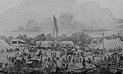 For that first fair, the York Pioneers Historical Society, on its own, relocated the 1794 Scadding Cabin settler's log cabin to the site.[10] The Grandstand show was a display of prize animals.[11] The track of the Military Reserve and its Grandstand was used for equestrian displays and several wooden structures were built for other exhibits and live stock.[8] Attendees arrived by carriage by Dufferin Street, by boat at two wharves, by the Great Western Railway line and the street railway, which was extended to Strachan Avenue.[6] A row of pens along the waterfront held the live stock. Sporting events included a half-mile foot race for a purse of CA$50 (equivalent to $1,815 in 2023) and a sculling race won by Jacob Gaudaur for a prize of CA$300 (equivalent to $10,889 in 2023).[12]