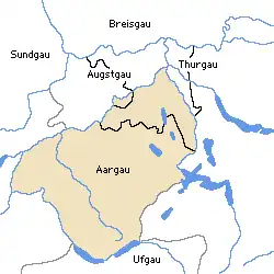 In the 10th century, the district was reduced in size and divided into Unteraargau and Oberaargau. The north-western part of today's canton was in the Frickgau and partly in the Sisgau, while the part east of the Reuss was in the Zürichgau. In 1033, the entire territory of Switzerland fell to the Holy Roman Empire. It was not until the 14th century that the term Aargau began to be used to describe the remaining areas.[19]