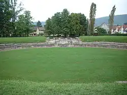 There were also three vici (village settlements): Aquae Helveticae (now Baden), a few kilometres east of Vindonissa on the Limmat, dates from around the time the camp was founded. It was known far and wide for its hot springs and thermal baths, but was also an important settlement for craftsmen.[10] Tenedo (now Bad Zurzach) was a roadside village on the Rhine, settled from the second quarter of the 1st century and used as a bridgehead for an important river crossing.[11] The vicus Lindfeld near Lenzburg (name unknown at the time, probably Lentia) existed from the second quarter of the 1st century. A theatre with 4000 seats formed the centre of a religious complex.[12]