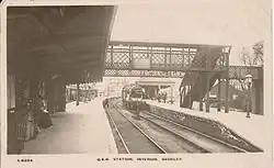 St Olaves station was situated some distance north of the point of intersection, and there were two stations named St Olaves Junction at the intersection, "High Level" on the ESR and "Low Level" on the Lowestoft Railway.[23] These were only exchange platforms and had no access from the public road.[5]