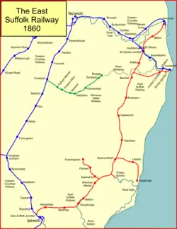The Waveney Valley Railway had been authorised in 1851 to build from Tivetshall on the EUR main line between Ipswich and Norwich, to Bungay. In 1853 it was granted authority to extend eastwards to Beccles, and at the time it appeared that this would be a further useful outlet for the traffic of the ESR. However the Waveney Valley company took some time to complete the line: it was not until 2 March 1863 that Beccles was reached, and by that time it was under the ownership of the GER.[18]
