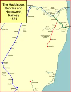 By that time, another independent concern proposed a line from the north. This new railway was called the Halesworth, Beccles and Haddiscoe Railway (HB&HR) and was authorised on 5 June 1851 with a share capital of £150,000. The route was to run from Haddiscoe, on the Reedham to Lowestoft line, via Beccles, and on to Halesworth, where it was expected to connect to the EUR's Woodbridge branch.[5][2][6]