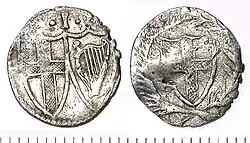 The Commonwealth of England (1649–60) is well known for having produced the only English coins which did not contain any Latin inscription at all. This was due to an association of Latin with Catholicism.[1] As far as the Commonwealth penny is concerned, the inscriptions are totally absent. The reverse shows St George's shield within a wreath, while the obverse shows St George's shield and an Irish shield, with the denomination I above them.
