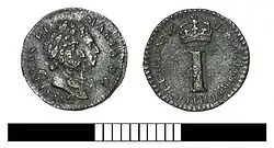 The same basic design continued in the short reign of James II (1685–1688) with the crowned "C" on the reverse replaced by a crowned "I" which acted not only as the king's initial "Iacobus" but as the indication of the denomination, 1 penny.