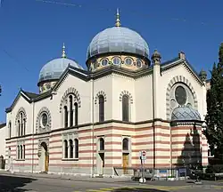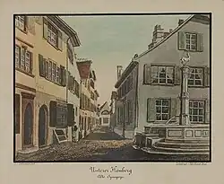 Unterer Heuberg was the site of a small synagogue built in the 1840s. It was the first prayer house belonging exclusively to the Jewish community, while previously Jews prayed in their private homes. The old synagogue was used until 1868, when the Great Synagogue (Grosse Synagoge Basel) was inaugurated. Following the 1871 annexation of Alsace by the Germans, many Alsatian Jews moved to Basel. Other newcomers came from the Southern Germany and from the Swiss “Judendörfer” Endingen and Lengnau, where Jews were allowed to settle since the 17th century. To accommodate the growing community, the Great Synagogue was expanded in 1892, just 30 years after its construction.[11]