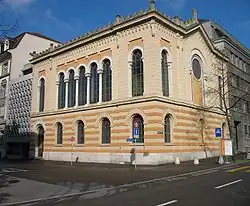 In the early 19th century, individual Jews were able to settle in Bern, but freedom of settlement was not established in the region until 1846.[4] Shortly afterwards, in 1848, Alsatian Jews founded the "Corporation of Israelites of the City of Bern", later renamed Jüdische Gemeinde Bern (Jewish Community of Bern). From 1856, the terraced house "Hinter den Speichern" on Anatomiegasse, (today's Genfergasse) served as the synagogue. The rabbi of Hegenheim attended to the congregation, and the dead were also buried there.[2] In 1871, the modern cemetery was established on Papiermühlestrasse, and in 1906, the community inaugurated its Moorish-Oriental synagogue on the corner of Kapellenstrasse and Sulgeneckstrasse. For some 30 years, there was a separate East European Jewish community.