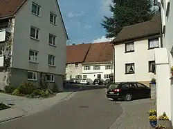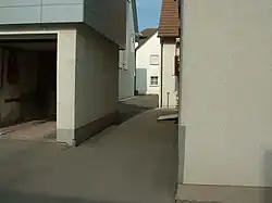 The settlement of the Jews in Laupheim developed on the so-called Judenberg ("Jews’ mountain" or rather "Jews’ hill") with the Judengasse ("Jews’ Lane") at its centre, a ghetto-like area, separated from the rest of the town, yet in close proximity to the market square. The Judenberg forms a regular square where the 8 oldest houses, arranged in 3 rows, are positioned parallel to one of the main streets leading away from the town centre.[10] The local Jews were allowed to influence the planning and design of their houses from the end of the 18th century onwards. It is remarkable, even today, that all houses are approachable from the front as well as the back, and that even the front yards and front gardens are not fenced in. The reason for this lies in the fact that the Judengasse was meant to incorporate the whole Jewish settlement to form an eruv.[19]